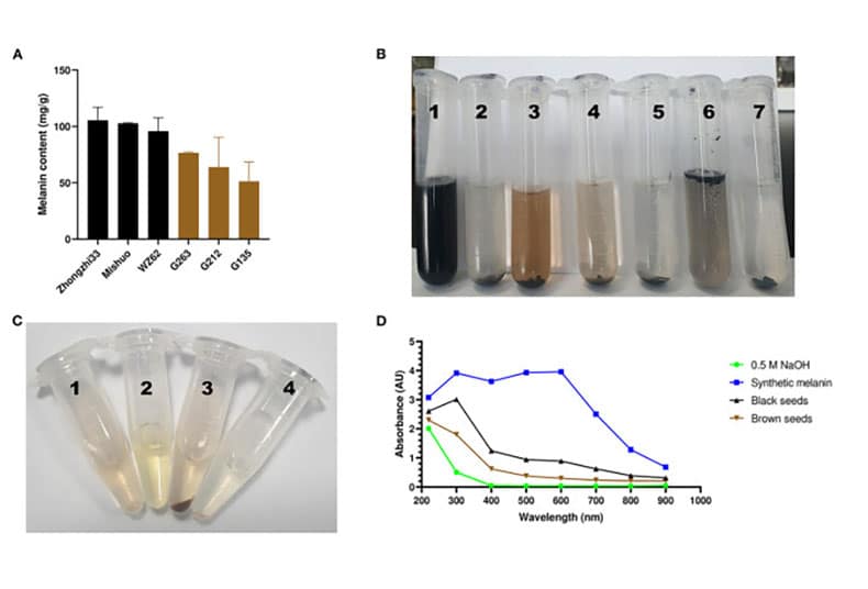 Variation, chemical, and UV-Vis absorbance characteristics of sesame melanins. (A) variation of melanin content in black and brown sesame seeds. (B) Solubility of the black sesame melanin. The serial numbers 1–7 on the tube correspond to melanin in an alkaline solution (0.5 M NaOH), H2O (pH 6.8), methanol (80%), ethanol, isopropyl alcohol, chloroform, and hexane, respectively. (C) Precipitation of the brown sesame seed melanin. The serial numbers 1–4 correspond to melanin in a sodium hydroxide solution (1 mg/mL) + 125 μL of ddH2O, 500 μL of ddH2O + 125 μL of 10 % FeCl3, melanin in a sodium hydroxide solution (1 mg/mL) + 125 μL of 10 % FeCl3, and melanin in a sodium hydroxide solution (1 mg/mL, pH 8.0) + 80 μL of 6 mol/L HCl. (D) UV–spectroscopy absorbance spectra of a synthetic melanin and the melanin pigments isolated from black and brown sesame seeds.