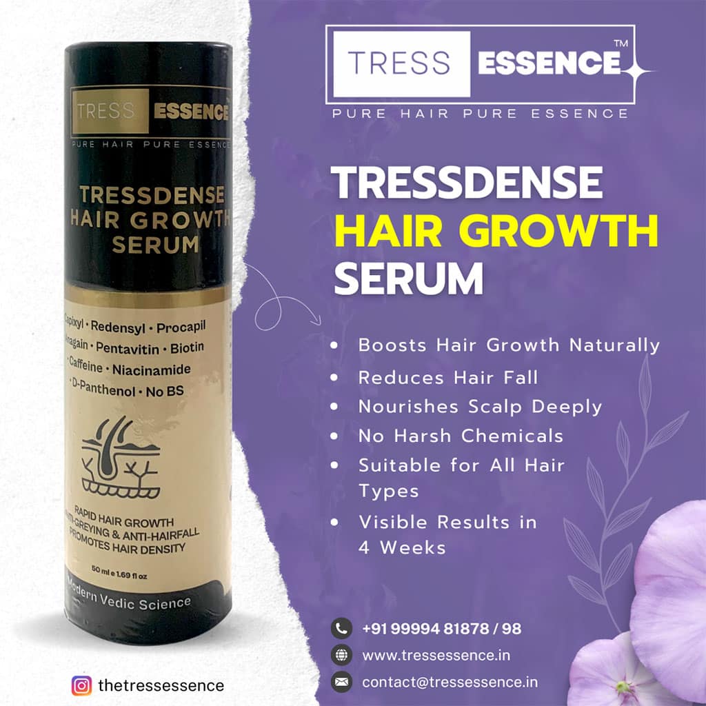 If you’re looking for a serum that combines all these powerful actives into one easy, non-greasy formula, look no further than Tress Essence’s Tress Dense Hair Growth Serum.
